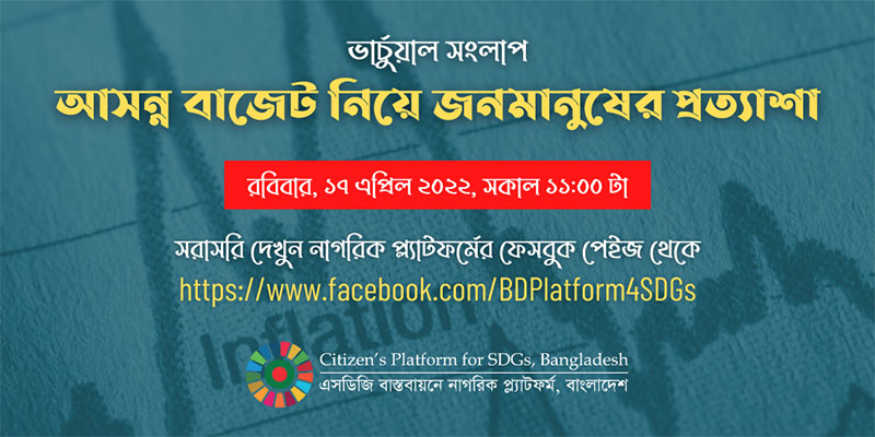 এসডিজি বাস্তবায়নে নাগরিক প্ল্যাটফর্ম, বাংলাদেশ ১৭ এপ্রিল, ২০২২ তারিখে “আসন্ন বাজেট নিয়ে জনমানুষের প্রত্যাশা” শীর্ষক একটি ভার্চুয়াল সংলাপের আয়োজন করে। উক্ত সংলাপে পিছিয়ে পড়া বিভিন্ন জনগোষ্ঠীর প্রতিনিধি ও নাগরিক প্ল্যাটফর্মের সহযোগী প্রতিষ্ঠানের সদস্যরা অংশ নেন। আসন্ন বাজেট থেকে পিছিয়ে পড়া জনগোষ্ঠীর প্রত্যাশা কী এবং তারা কোন্ ধরনের চ্যালেঞ্জের সম্মুখীন হচ্ছেন – সেই বিষয়ে আলোচনা হয়।